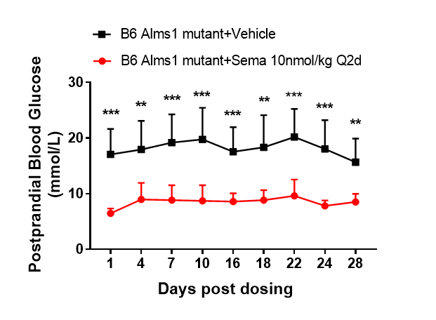 ͼ9. Semaglutide¸ÉÔ¤ÏÔÖø½µµÍÁËB6-Alms1Í»±äСÊó²ÍºóѪÌÇˮƽ¡£Êý¾ÝÒÔMean¡ÀSDչʾ¡£Ê¹ÓÃunpaired two-tailed Student's t-test·½·¨½øÐÐͳ¼ÆÑ§·ÖÎö¡£**£¬p<0.01£»***£¬p<0.001¡£