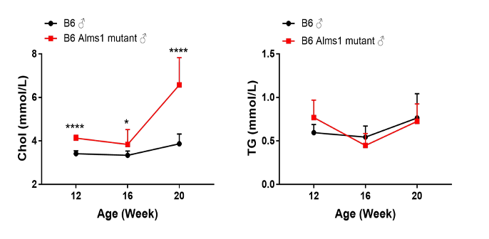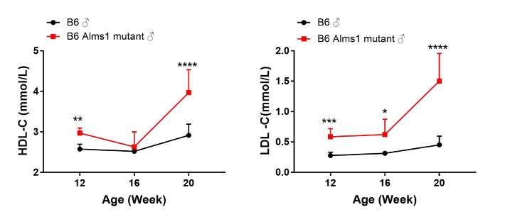 ͼ4. Ëæ×ÅÄêÁäÔö³¤£¬C57BL/6-Alms1-delСÊó¸ßѪ֬±íÐ͸ü¼ÓÑÏÖØ¡£Êý¾ÝÒÔMean¡ÀSDչʾ£¬n=5¡£Ê¹ÓÃunpaired two-tailed Student's t-test·½·¨½øÐÐͳ¼ÆÑ§·ÖÎö¡£**£¬p<0.05£¬**£¬p<0.01£»***, p<0.001£»****, p<0.0001¡£