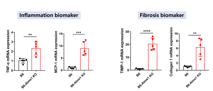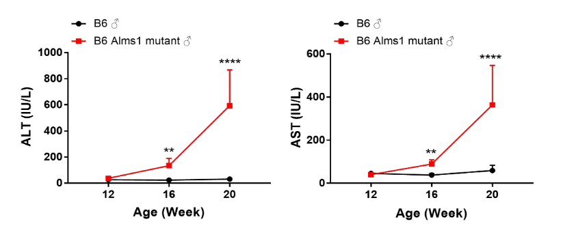 ͼ5. C57BL/6-Alms1-delСÊóÔÚ16ÖÜʱ¹Û²ìµ½¸ÎËðÉË¡£Êý¾ÝÒÔMean¡ÀSDչʾ£¬n=5¡£Ê¹ÓÃunpaired two-tailed Student's t-test·½·¨½øÐÐͳ¼ÆÑ§·ÖÎö¡£**£¬p<0.01£»****, p<0.0001¡£