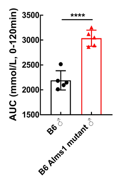 ͼ2. ¶ÔÕÕ×éºÍC57BL/6-Alms1-delСÊó10ÖÜÁäʱ½øÐÐÄÍÌÇʵÑé¡£ÔÚ0¡¢15¡¢30¡¢60¡¢90ºÍ120minʱ²âÁ¿ÑªÌÇ¡£½á¹ûÏÔʾC57BL/6-Alms1-delСÊóÌÇÄÍÁ¿½µµÍ¡£Êý¾ÝÒÔMean¡ÀSDչʾ£¬n=5¡£Ê¹ÓÃunpaired two-tailed Student's t-test·½·¨½øÐÐͳ¼ÆÑ§·ÖÎö¡£****£¬p<0.000